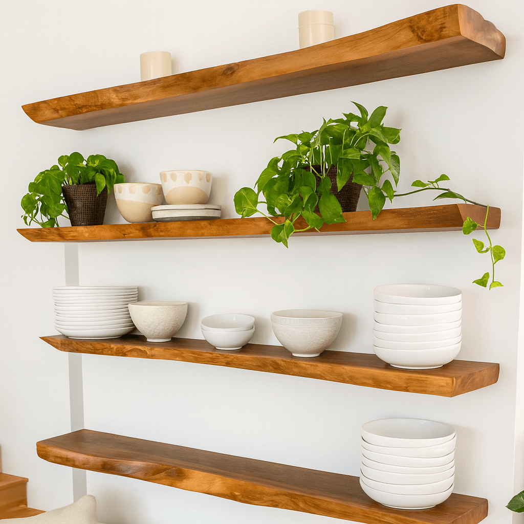 Bring home the beauty of nature with our handmade live edge floating shelves. We use only premium quality slabs in the manufacture of our shelves and will add a natural elegance to any space.