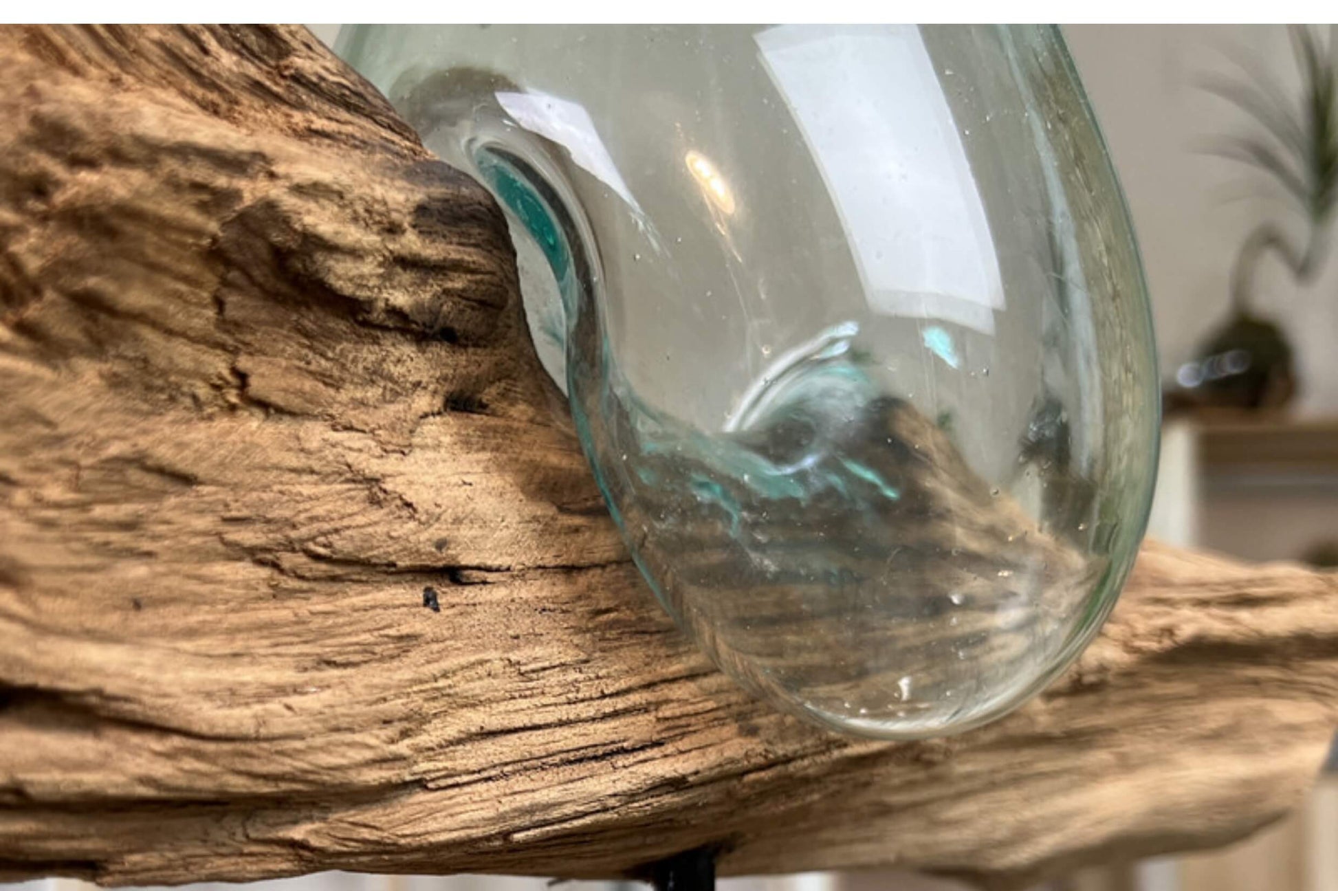 Enhance your home with our stunning Molten Glass on Driftwood Terrarium, an exquisite blend of artistry and nature. Each piece is uniquely handcrafted, featuring recycled glass carefully hand-blown onto authentic driftwood. The glass organically molds to the wood's natural shape, creating an exclusive, captivating centerpiece.