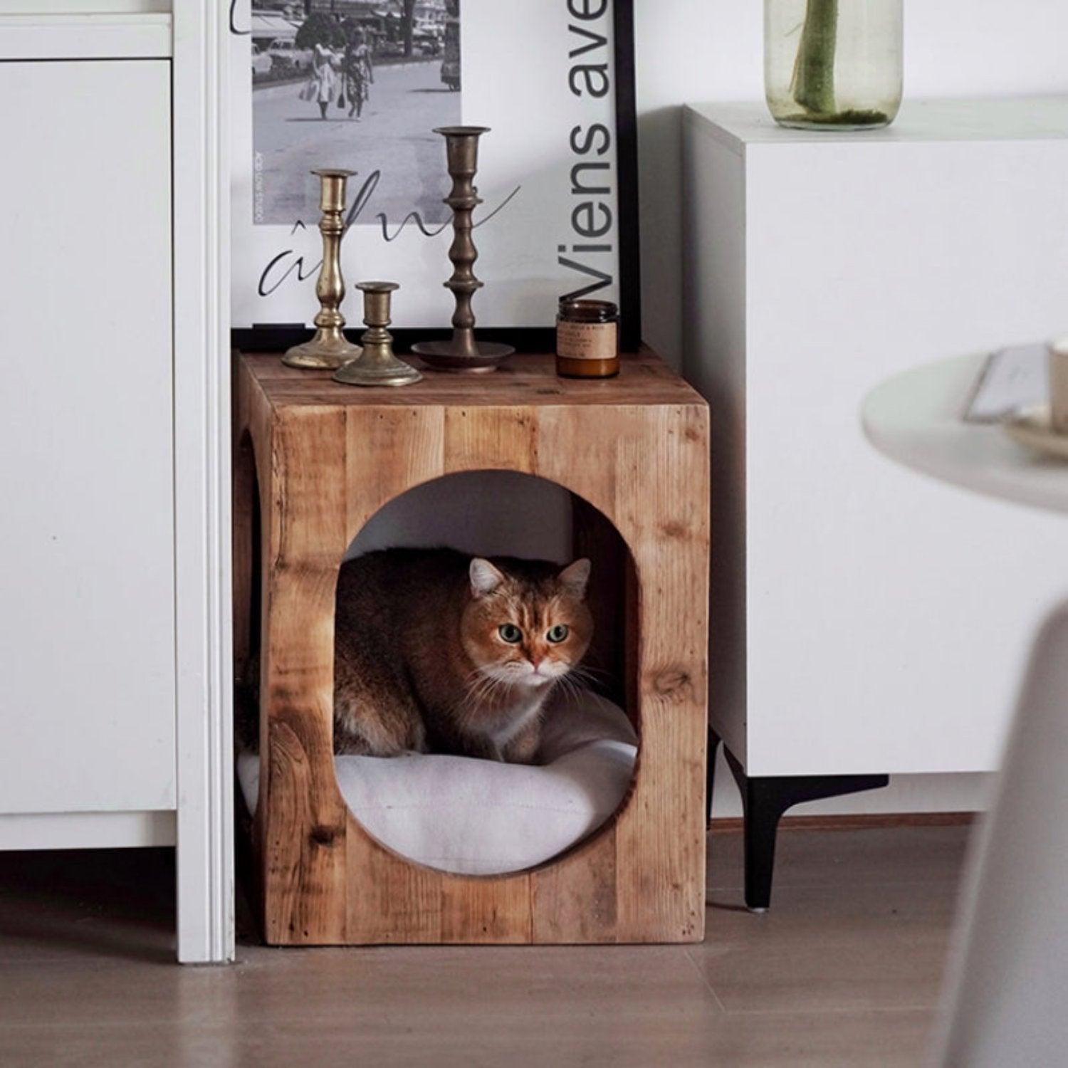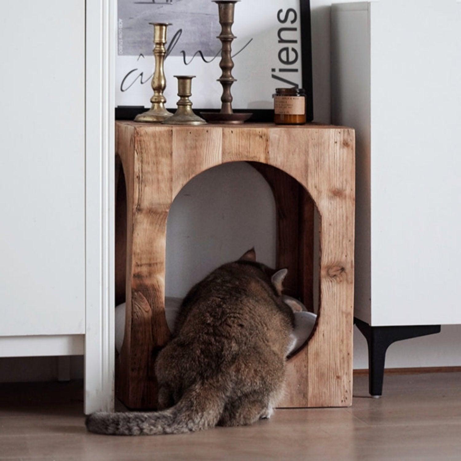 This versatile piece is perfect for pet owners who want to blend practical furniture with pet-friendly design. Add a warm, rustic accent to your home while giving your cat their own special space.