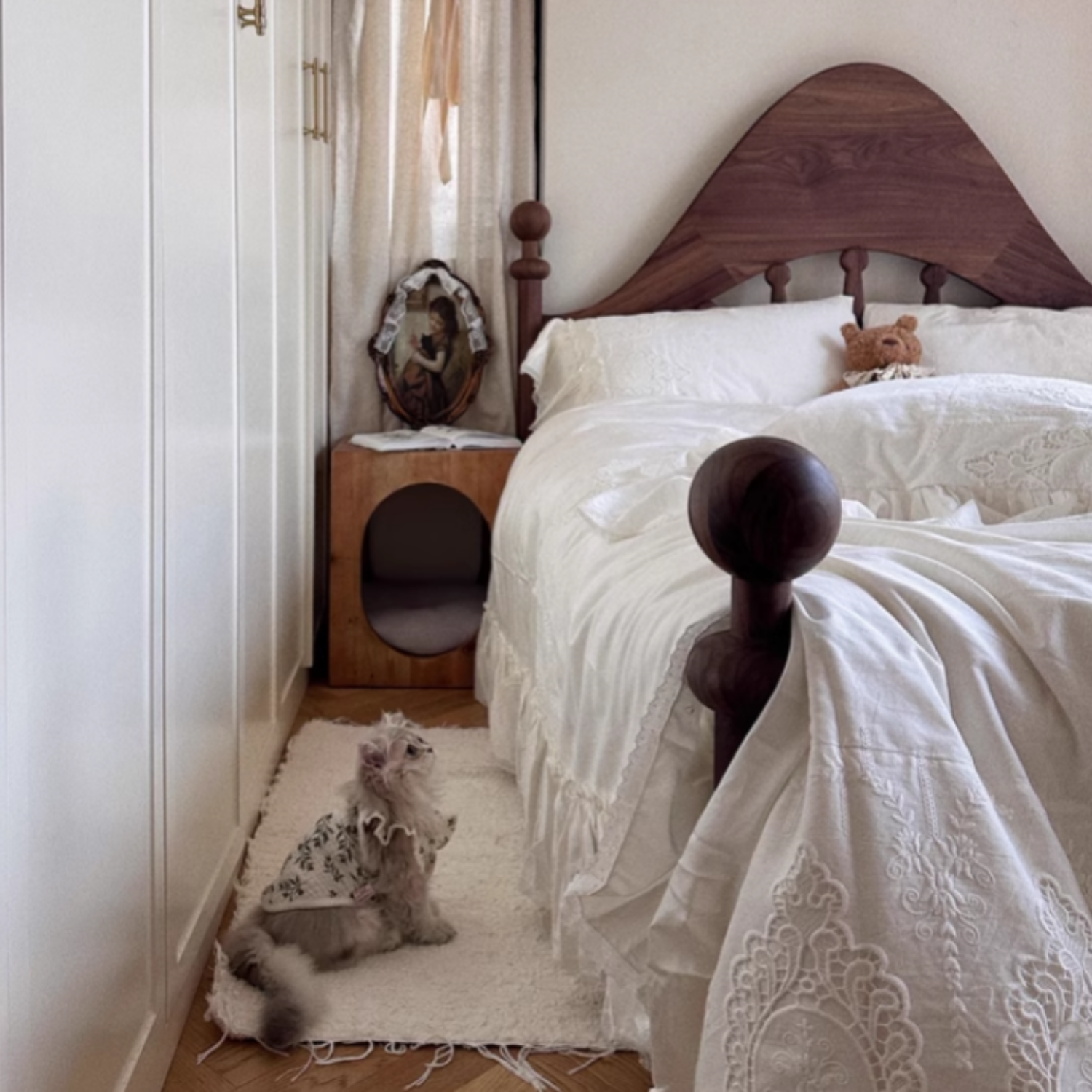 - Dual-purpose design: functional coffee table or nightstand with a hidden pet retreat