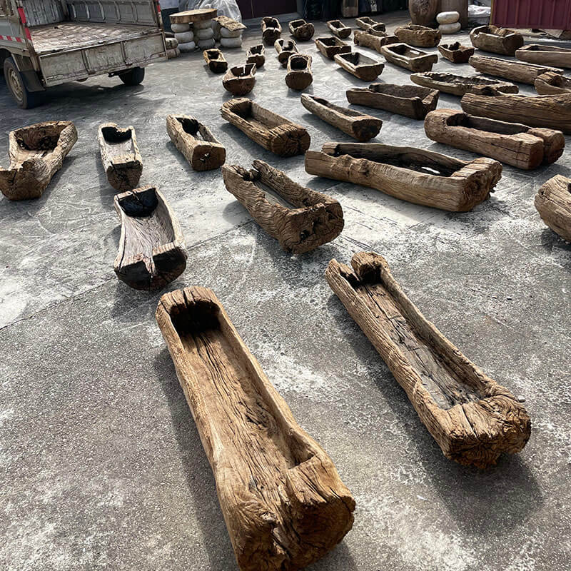 Each trough is left in its natural, solid state, preserving the authentic texture and character of the weathered wood. The rich gray patina of the wood contrasts beautifully with vibrant plants, creating a captivating focal point in any space.