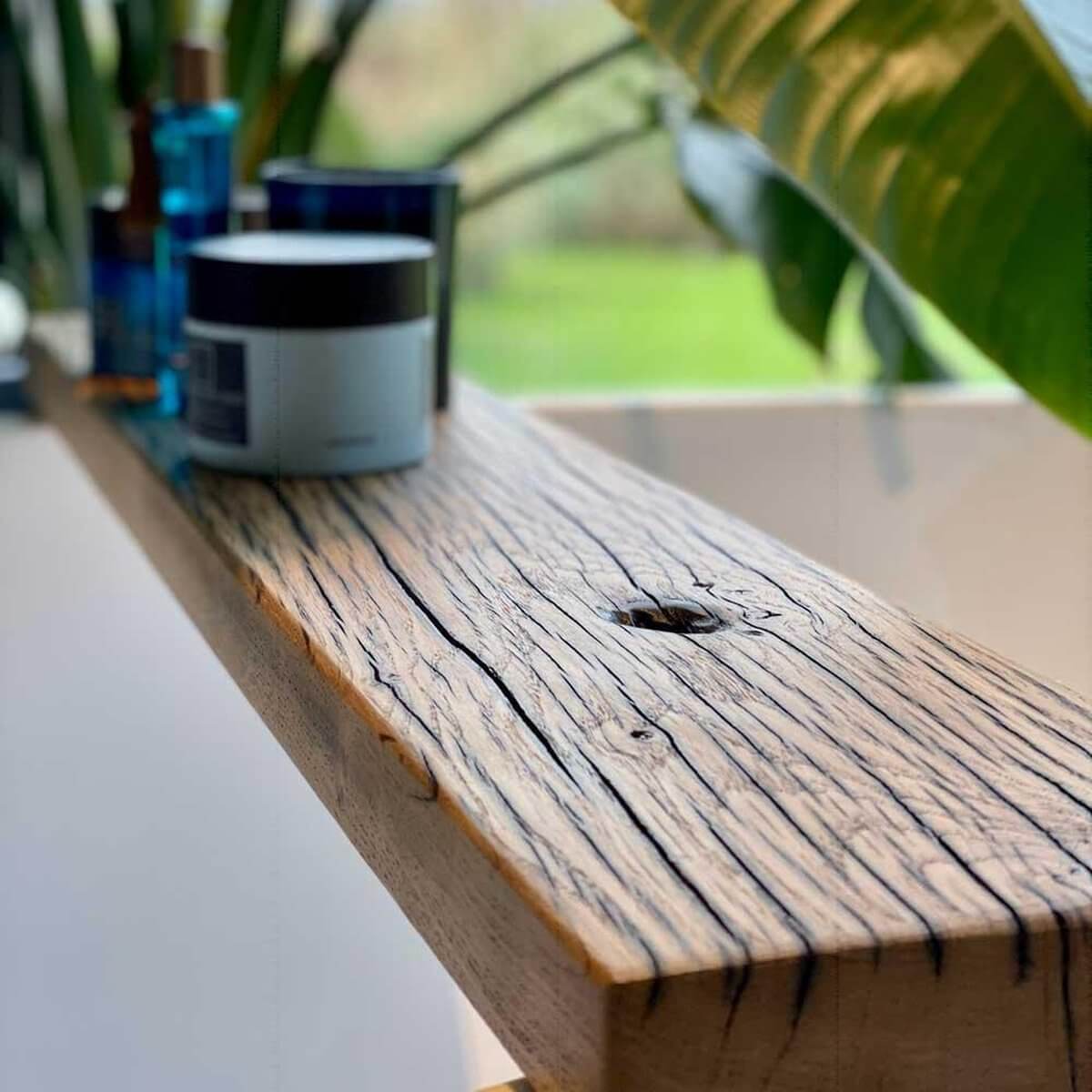Elevate your bathroom decor with timeless rustic elegance—order your Reclaimed Elm Wood Bathroom Shelf today!